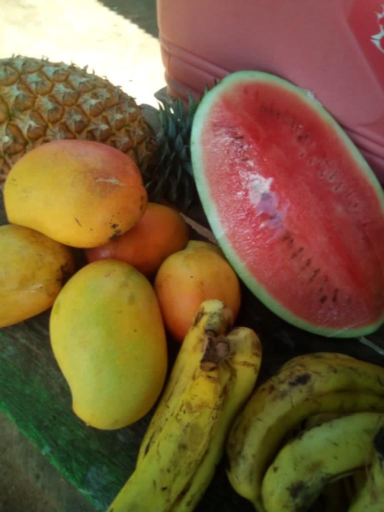In seinem Garten baut er ganz verschiedenes Obst und Gemüse an. Bei unseren Besuchen können wir uns an Ananas, Maniok (eine Art Wolfsmilchgewächse), Zuckerrohr, Paprika, Mais, Aubergine, Papaya, Mango und natürlich Kokosnuss erfreuen. Ganz neu hat Kim Tomaten im Sortiment. Hierfür hat er eine Art Gewächs- oder Schattenhaus gebaut.