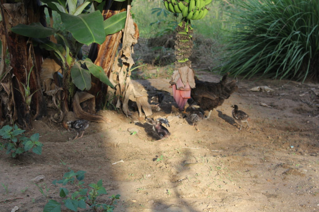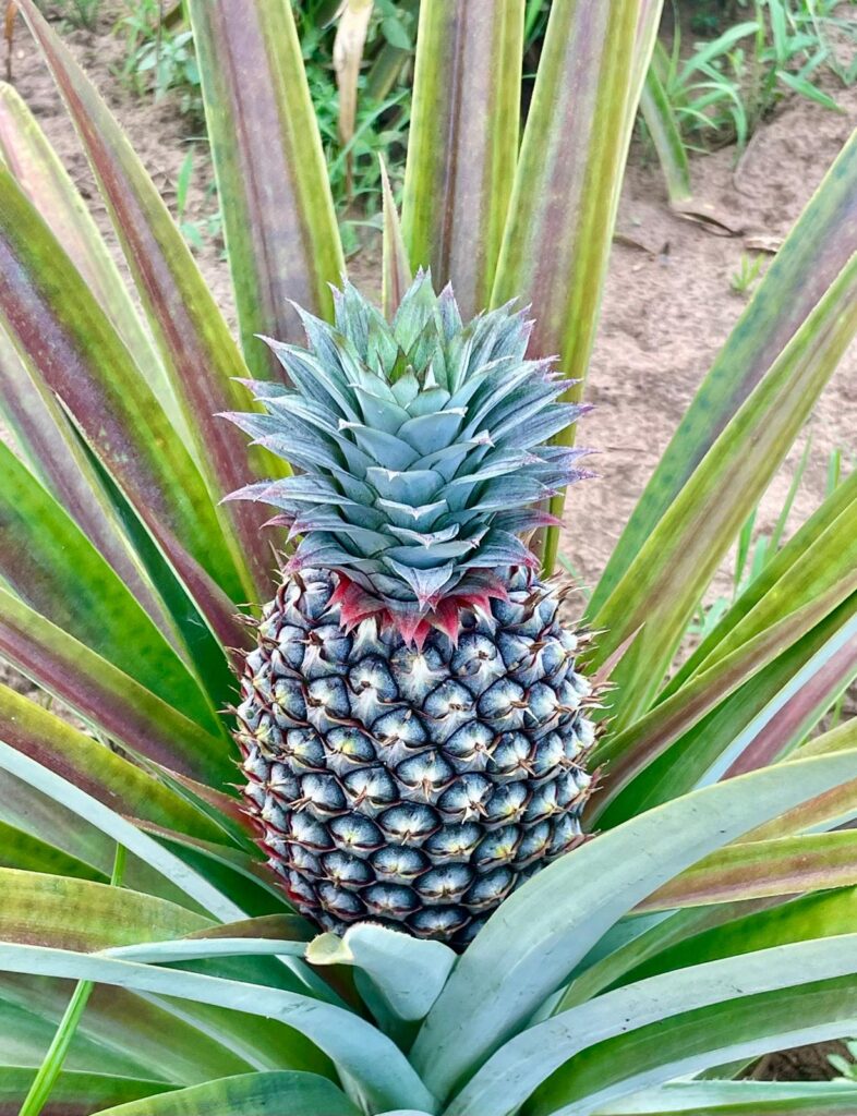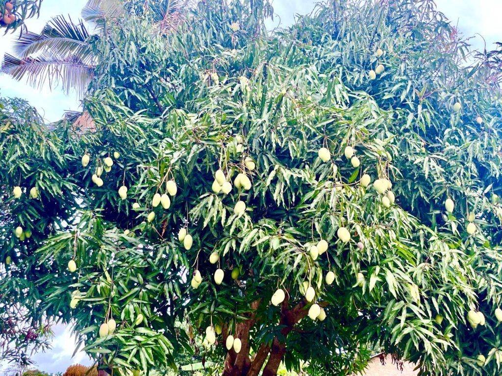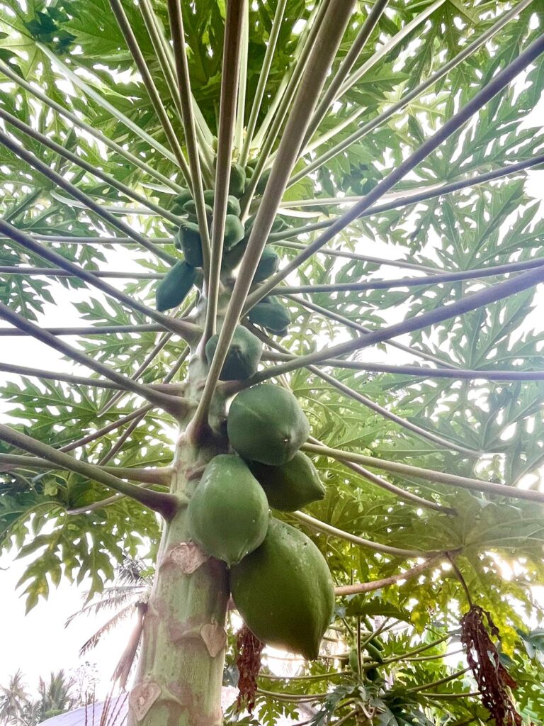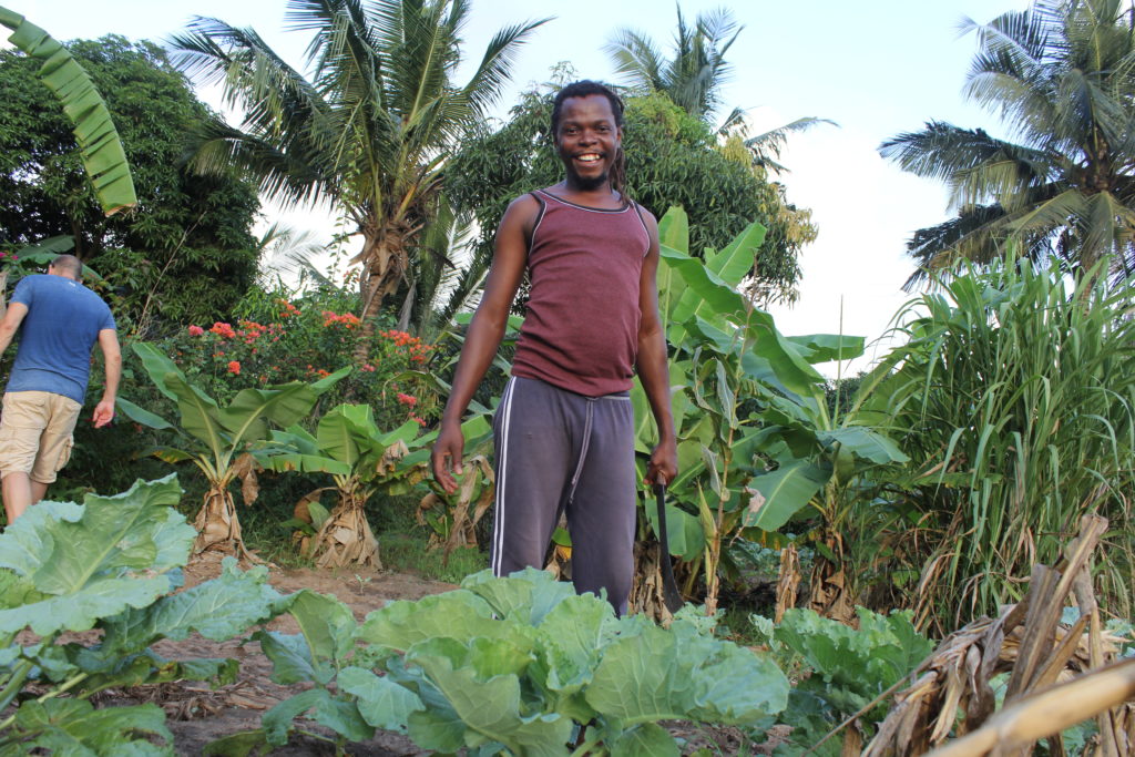 In seinem Garten baut er ganz verschiedenes Obst und Gemüse an. Bei unseren Besuchen können wir uns an Ananas, Maniok (eine Art Wolfsmilchgewächse), Zuckerrohr, Paprika, Mais, Aubergine, Papaya, Mango und natürlich Kokosnuss erfreuen. Ganz neu hat Kim Tomaten im Sortiment. Hierfür hat er eine Art Gewächs- oder Schattenhaus gebaut.