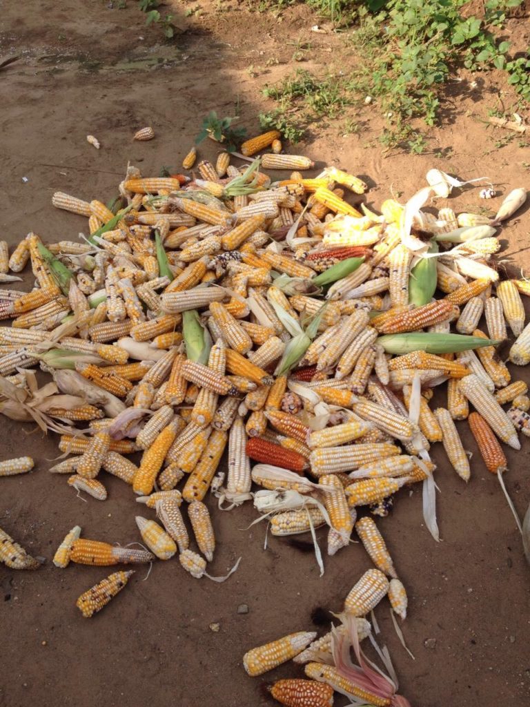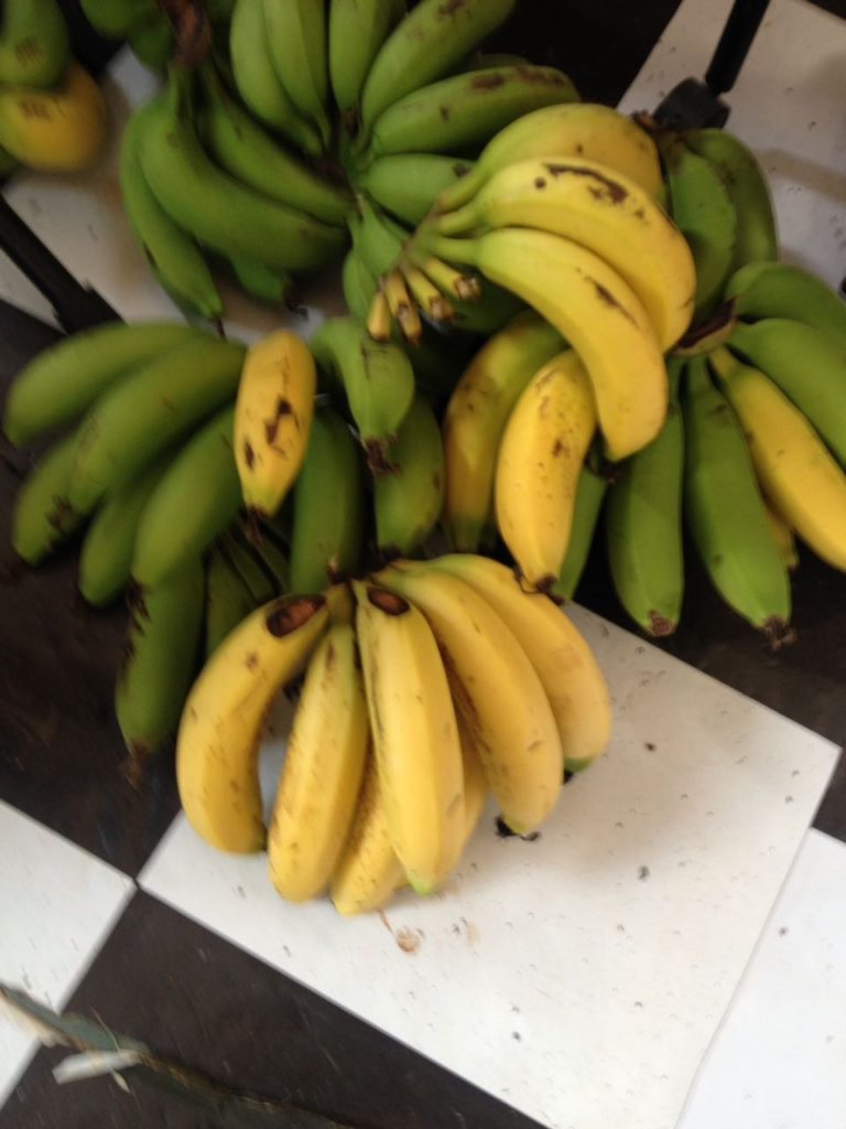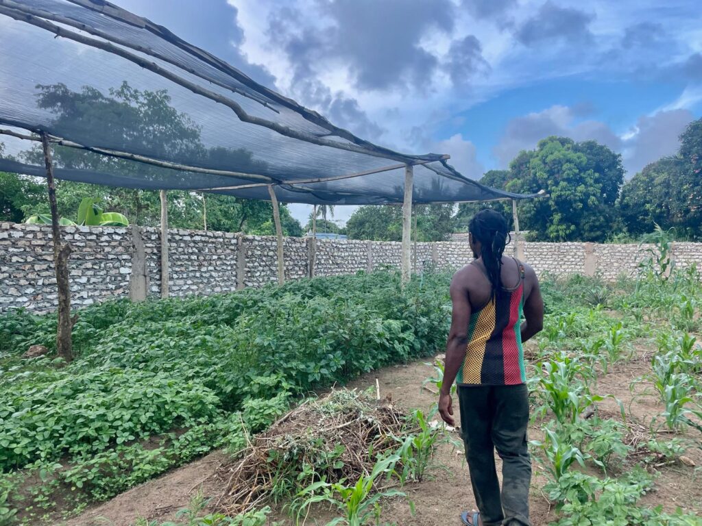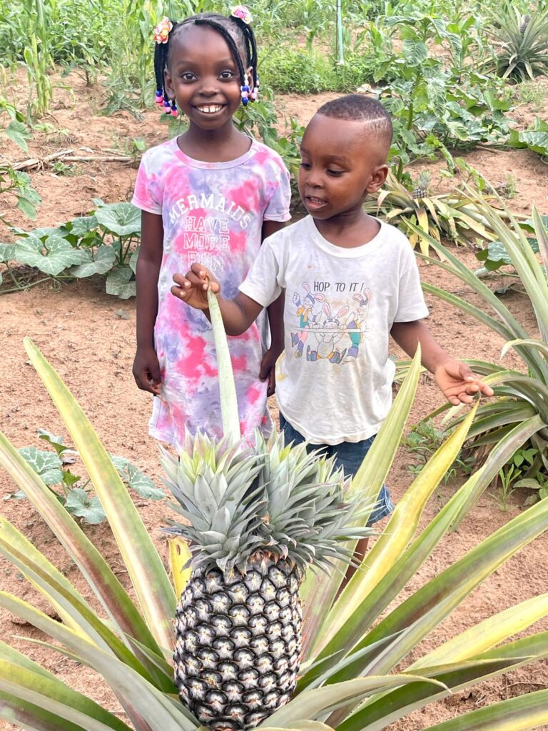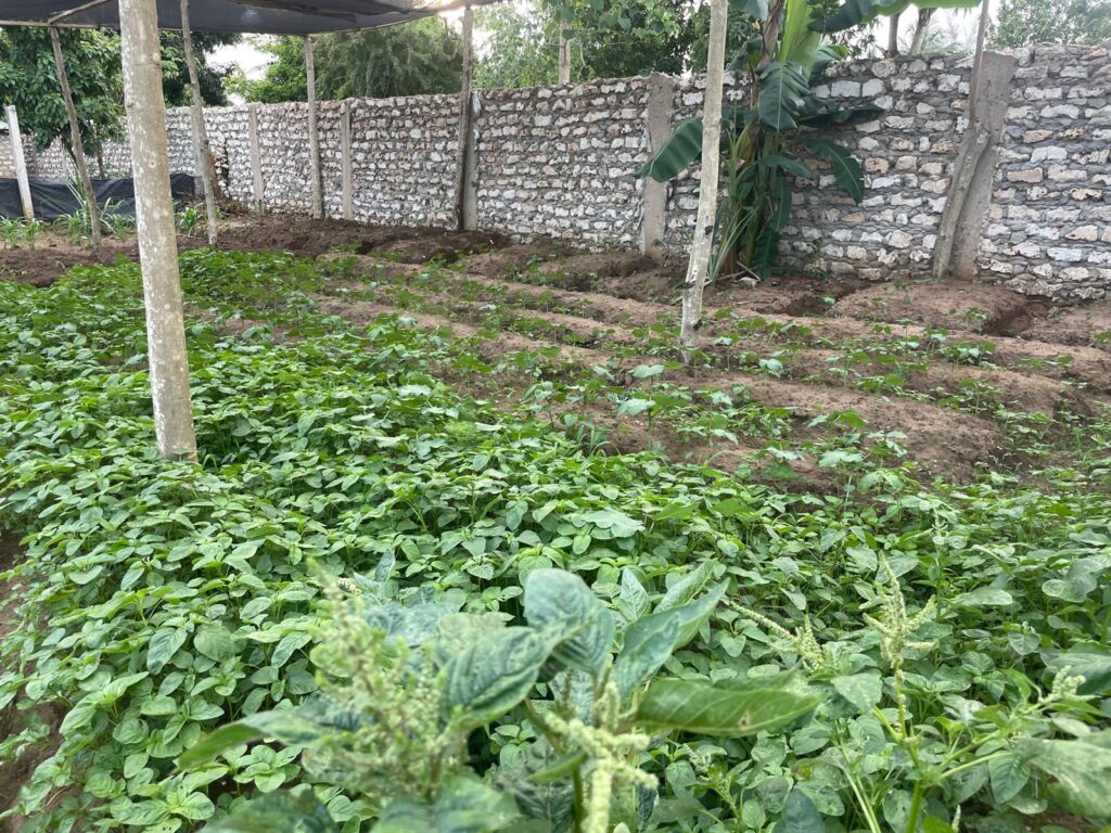 In seinem Garten baut er ganz verschiedenes Obst und Gemüse an. Bei unseren Besuchen können wir uns an Ananas, Maniok (eine Art Wolfsmilchgewächse), Zuckerrohr, Paprika, Mais, Aubergine, Papaya, Mango und natürlich Kokosnuss erfreuen. Ganz neu hat Kim Tomaten im Sortiment. Hierfür hat er eine Art Gewächs- oder Schattenhaus gebaut.